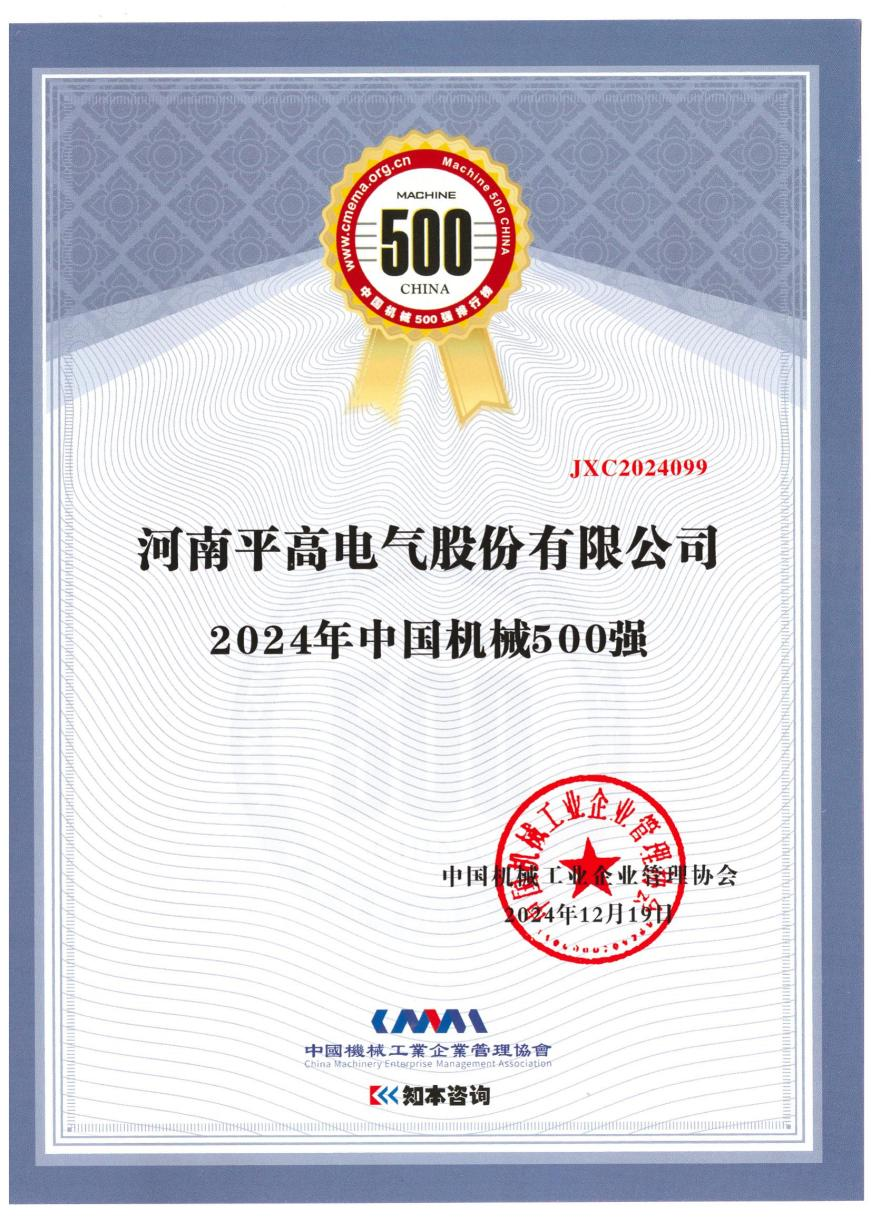 12月25日,從河南sg99.xy丝瓜视频電氣股份有限公司(以下簡稱“sg99.xy丝瓜视频電氣”)獲悉,在(zài)近日中國機械工業企業管理協會召開的2024年世界一流暨中國機械(xiè)500強研究(jiū)報告發布、示範工程表彰大會上,平(píng)高電氣憑(píng)借卓越的綜合實力成功斬獲“2024年中國(guó)機械500強”榮譽稱號,這一佳績是其多年來穩健發展的有力見證,也彰(zhāng)顯了其(qí)在行業(yè)內不斷攀(pān)升的影響力。